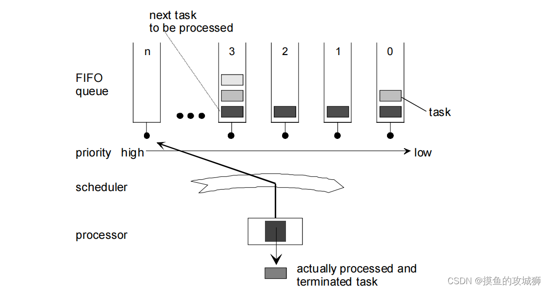 任务优先级(优先级)决定下一个准备就绪的任务将被转移到运行状态。为了提高效率,不支持动态优先级管理。因此,任务的优先级是静态定义的,即用户在执行时不能更改它。