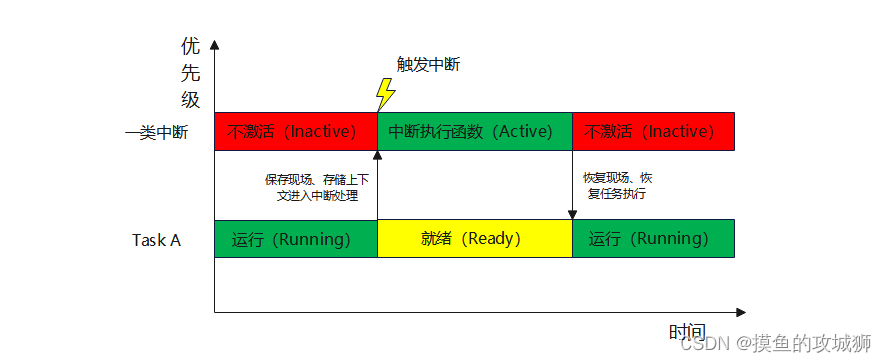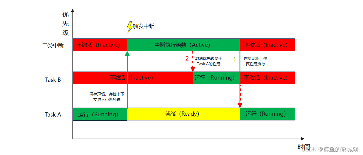 ##如图二类中断可调用OS资源,在中断内激活优先级高于TaskA的任务TaskB,则在执行完TaskB后进行返回TaskA继续执行;或者执行完直接返回TaskA中断位置继续执行