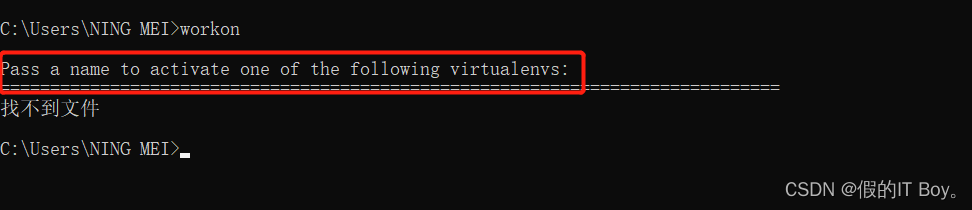 (2)输入workon,检查是否安装成功。(该提示其实是已经安装成功了的,它只是提示在该目录下还没有创建虚拟环境而已)
