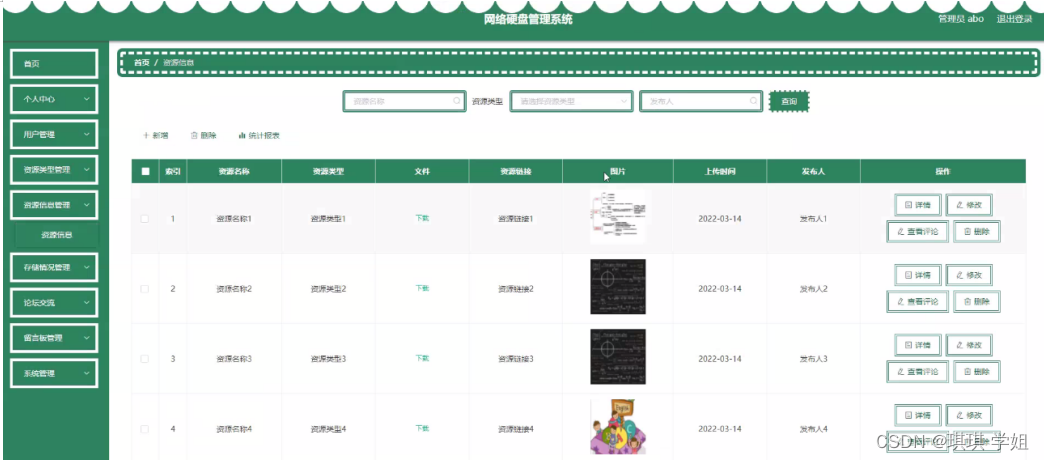 资源信息管理,在资源信息管理页面可以对索引、资源名称、资源类型、文件、资源链接、图片、上传日期、发布人等内容进行详情、修改、查看评论、删除或新增、下载文件等操作,如图5-11所示。
