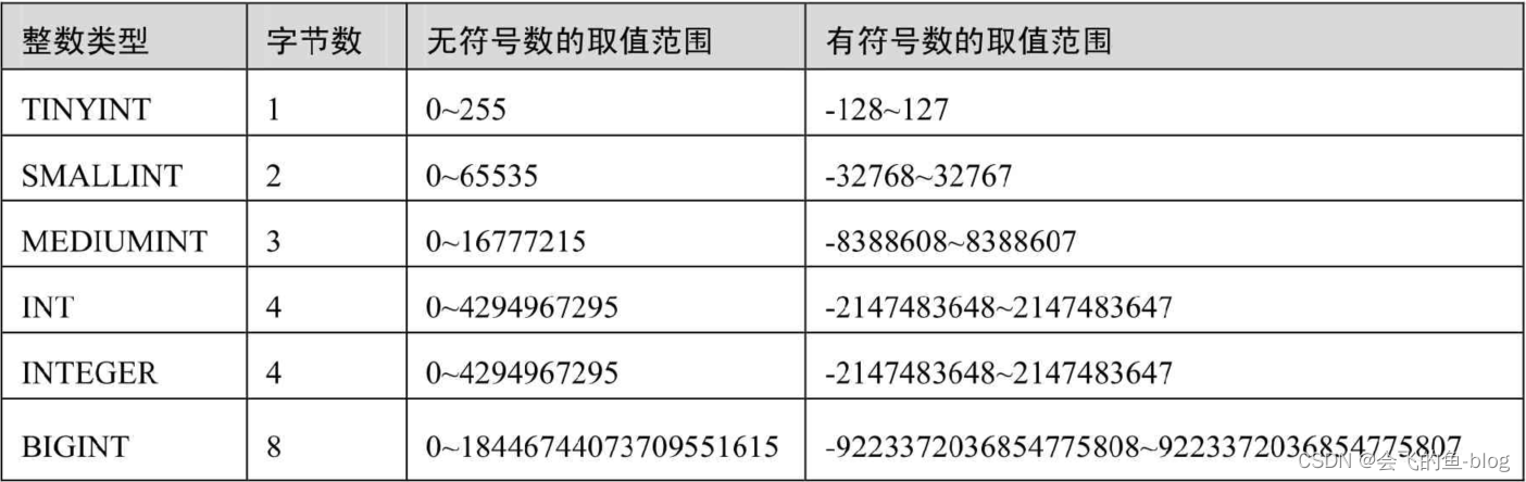 整数类型是数据库中最基本的数据类型。标准SQL中支持INTEGER和SMALLINT这两种数据类型。MySQL数据库除了支持这两种类型以外,还扩展支持了TINYINT、MEDIUMINT和BIGINT。下表从不同整数类型的字节数、取值范围等方面进行对比。