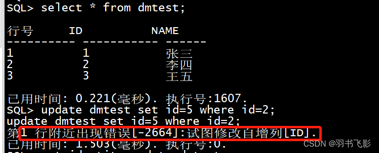 此时update修改会报错,提示:行附近出现错误[-2664]:试图修改自增列[ID].因此,update无法对自增列进行修改。
