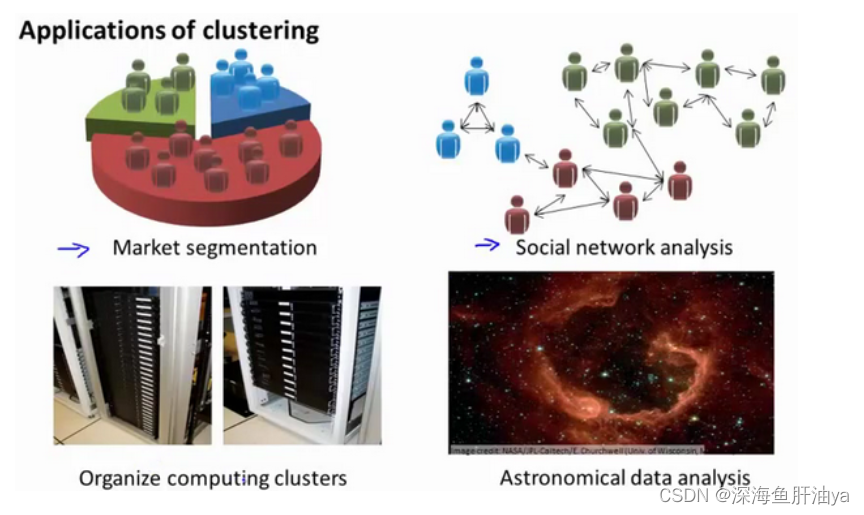 在这门课程的早些时候,我曾经列举过一些应用:比如市场分割。也许你在数据库中存储了许多客户的信息,而你希望将他们分成不同的客户群,这样你可以对不同类型的客户分别销售产品或者分别提供更适合的服务。社交网络分析:事实上有许多研究人员正在研究这样一些内容,他们关注一群人,关注社交网络,例如Facebook,Google+,或者是其他的一些信息,比如说:你经常跟哪些人联系,而这些人又经常给哪些人发邮件,由此找到关系密切的人群。因此,这可能需要另一个聚类算法,你希望用它发现社交网络中关系密切的朋友。我有一个朋友正在研究这个问题,他希望使用聚类算法来更好的组织计算机集群,或者更好的管理数据中心。因为如果你知道数据中心中,那些计算机经常协作工作。那么,你可以重新分配资源,重新布局网络。由此优化数据中心,优化数据通信。