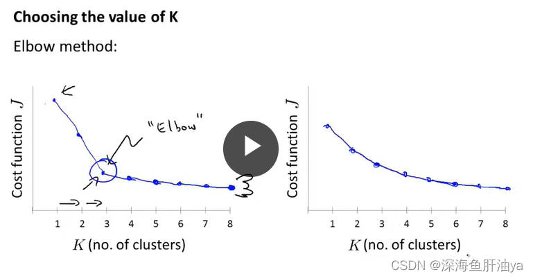 需要一个个试k值,横轴是k值,纵轴是成本函数值J,看到左侧的图,最开始k增加的时候,成本J下降的很快,但是当越过了某个点之后,J减小的就很慢了,这条曲线像我们的手肘弯起来了,所以叫肘部法则,即选取那个“肘部的点”,在左图中是k=3的点。但是通常我们实际情况下遇到的都是右边那个图,比较平滑,没有左边那个图拐弯拐的那么明显,所以不太好判断哪个是肘部点。