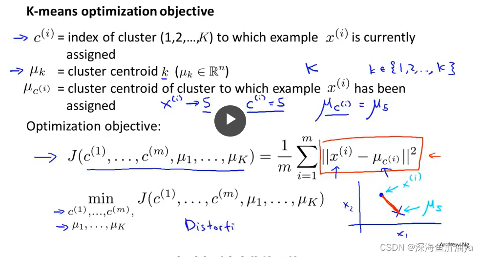 下图中的J即是成本函数,又叫失真函数,注意并不是x^(i)要和每个簇中心都要做相减取平方的操作,而是某个簇内的所有点要和自己这个簇的中心做相减取平方的操作,然后把每个点这般操作之后的差值之和做一个均值。K-means就是把这个均值函数的值降到越低越好,最后找到对应的c^(i)和u_k
