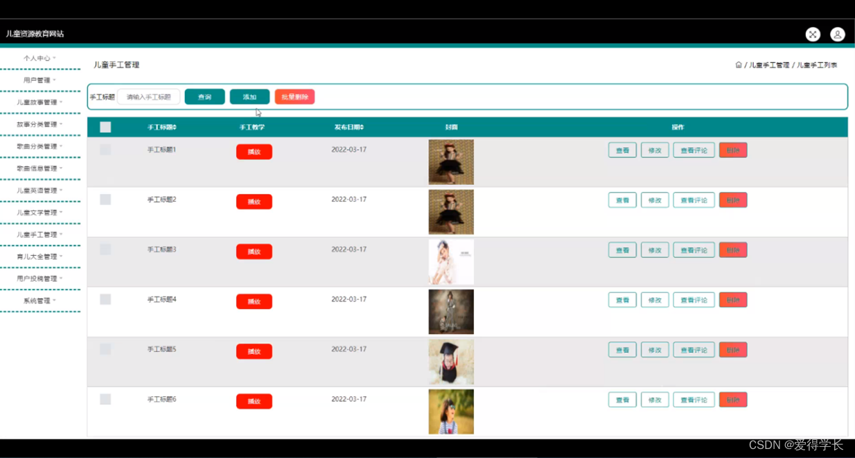 儿童手工管理,在儿童手工管理页面可以对手工标题,手工教学,发布日期,封面等内容进行查看,修改,查看评论和删除等操作,如图5-12所示。