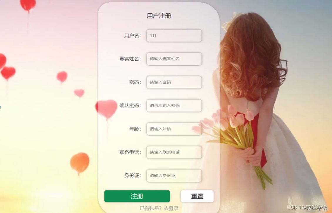 用户如果想在平台前台进行其他操作,则需要注册和登录,点击用户注册,通过填写用户名、真实姓名、密码、确认密码、年龄、联系电话、身份证等信息完成会用户册操作,用户注册后,输入用户账号和密码登录到系统前台,如图5-2所示。