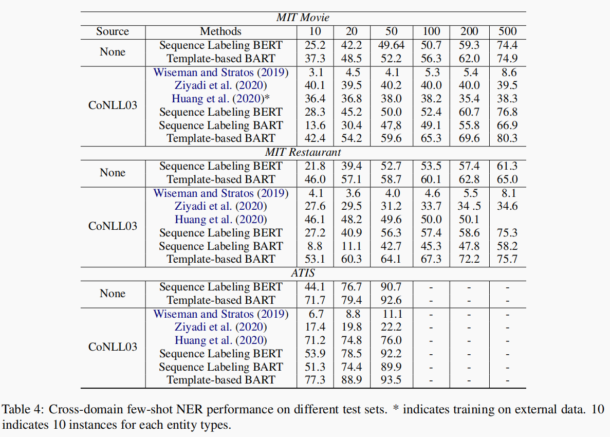本文在in-domain的设置下仅仅对四种类型实体中的两种使用了少样本设置,实验结果如下表,带*的表示少样本类别。
