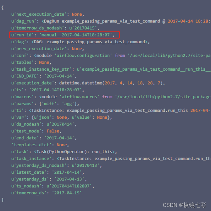 run_id是什么呢?原来每个DAG 实例都有一个上下文的概念,以context参数的形式会透传给所有的任务,以及所有任务的回调函数。run_id也在context中,其含义是DAG运行实例id