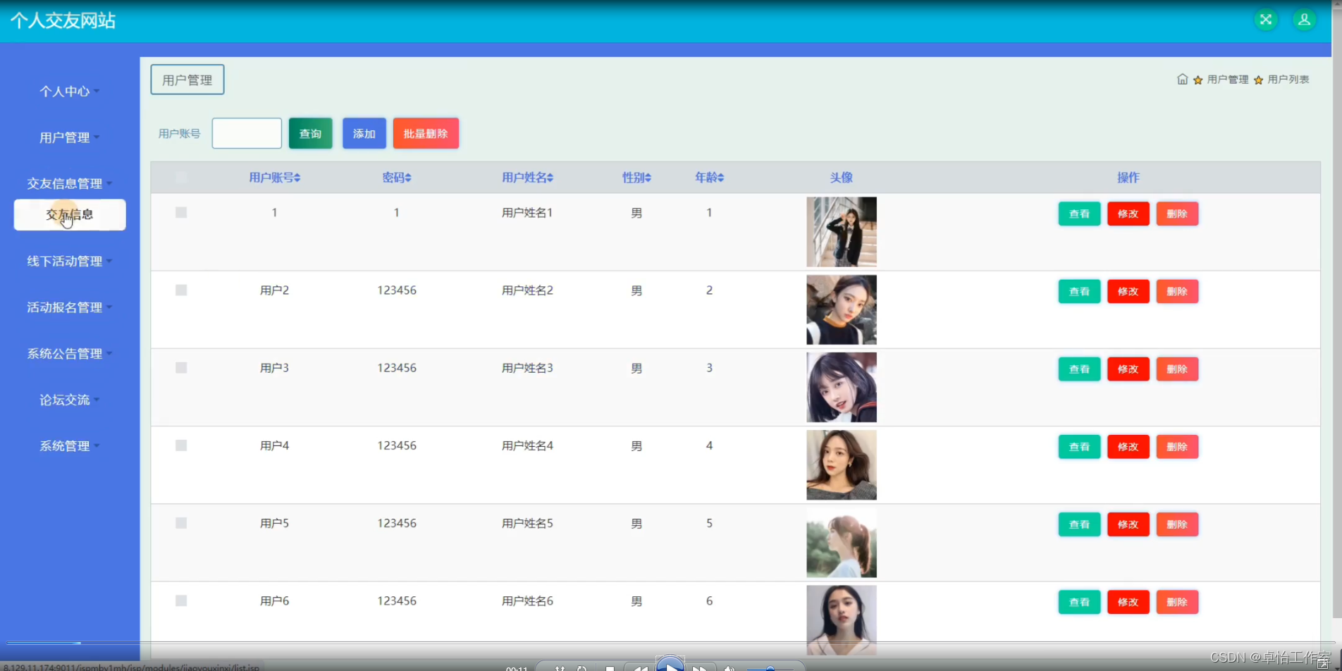 个人交友网站的主要使用者分为管理员和用户,实现功能包括管理员:个人中心、用户管理、交友信息管理、线下活动管理、活动报名管理、系统公告管理、论坛交流、系统管理,用户:个人中心、交友信息管理、活动报名管理、我的收藏管理,前台首页;首页、交友信息、线下活动、系统公告、论坛信息、我的、跳转到后台、客服等功能。由于本网站的功能模块设计比较全面,所以使得整个个人交友网站信息管理的过程得以实现。