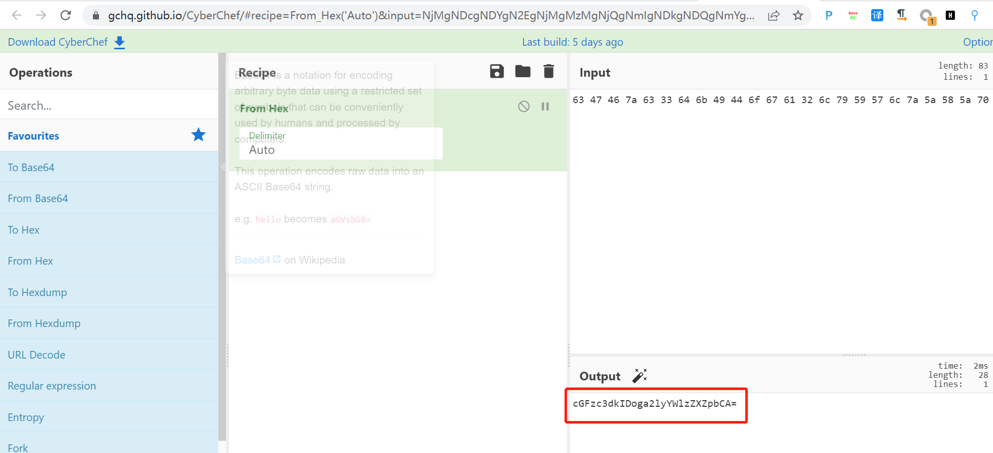 在系统目录下收集信息,在/opt目录下发现一串16进制字符串:63 47 46 7a 63 33 64 6b 49 44 6f 67 61 32 6c 79 59 57 6c 7a 5a 58 5a 70 62 43 41 3d,并且告诉我们使用cyberchef(解密网站)。
