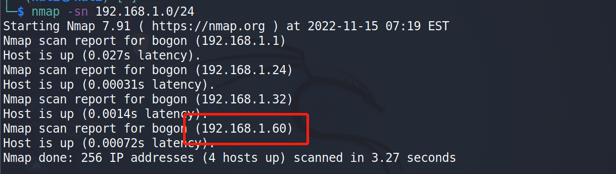 通过nmap扫描下网段内的存活主机地址,确定下靶机的地址:nmap 192.168.1.0/24,获得靶机地址:192.168.1.60