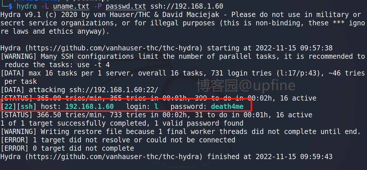 使用hydra对靶机进行账户名和密码进行爆破,成功获取到账户民和密码:l/death4me。