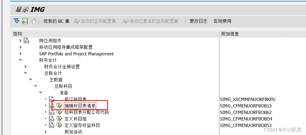 菜单路径: SPRO:财务会计->总账会计->主数据->总帐科目->准备->编辑科目表清单