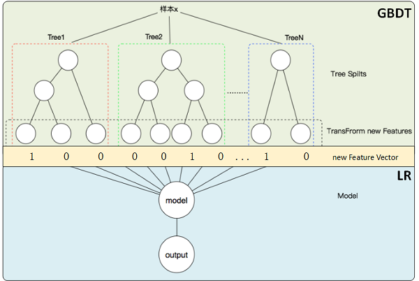 但FM等方法只能够做二阶的特征交叉,更高阶的,可以利用GBDT自动进行筛选特征并生成特征组合,也就是提取GBDT子树的特征划分及组合路径作为新的特征,再把该特征向量当作LR模型输入,也就是经典的GBDT +LR方法。(需要注意的,GBDT子树深度太深的化,特征组合层次比较高,极大提高LR模型拟合能力的同时,也容易引入一些噪声,导致模型过拟合)