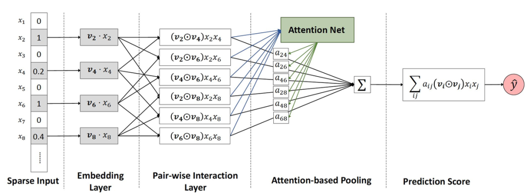 注意力因子分解机(Attentional Factorization Machine,AFM)模型也是Wide&Deep 框架中的一种,它通过添加 Attention 网络,自动学习不同特征之间交互的重要性。