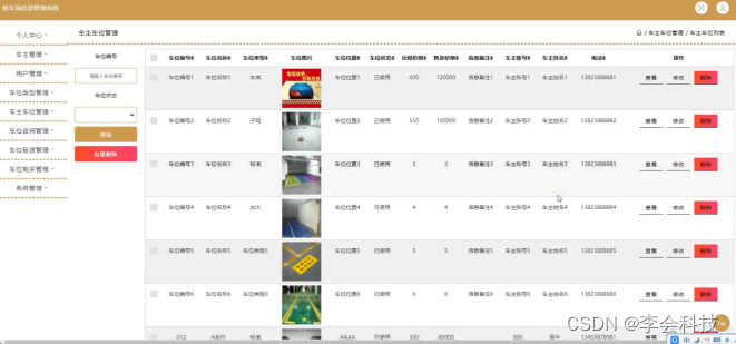 车主车位管理,在车主车位管理页面可以对车位编号,车位名称,车位类型,车位图片,车位位置,车位状态,出租价格,售卖价格,信息备注,车主账号,车主姓名,电话等内容进行查看,修改和删除等操作,如图5-12所示。