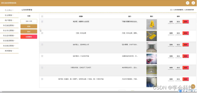 系统管理,在系统公告管理页面可以对标题,简介,图片等内容进行查看,修改或删除等操作,还可以对轮播图管理进行详细的操作管理;如图5-10所示。