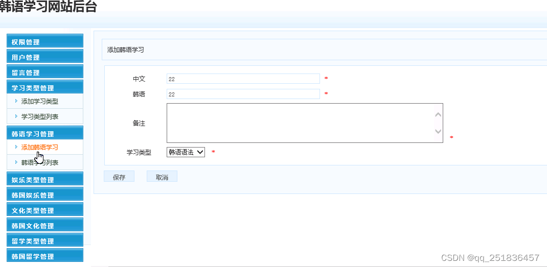 (5)韩语学习管理:对韩语学习信息进行添加、删除、修改和查看