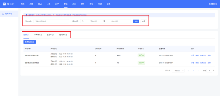 平台管理可以通过输入活动名称、活动时间来查询活动,活动的状态有全部、未开始、进行中、已结束等