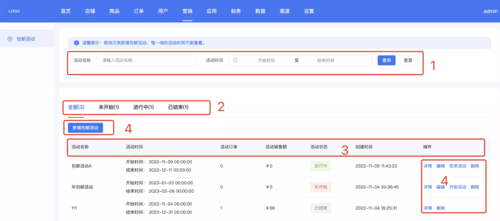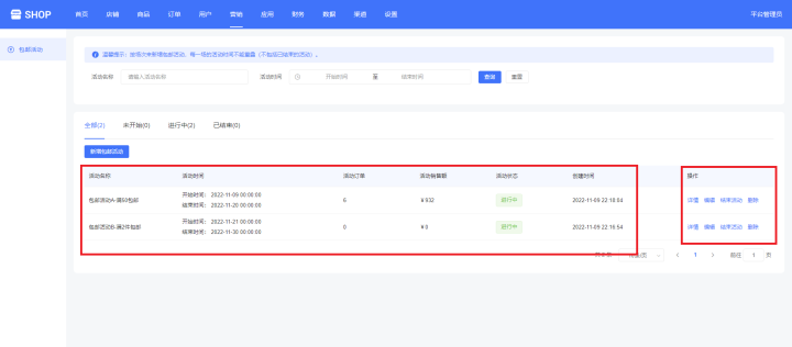 下面可以看到活动名称、活动时间、活动订单、活动销售额、活动状态、创建时间等,还可以对活动进行详情、编辑、删除等活动,对进行中的活动可以提前结束活动,如下图所示: