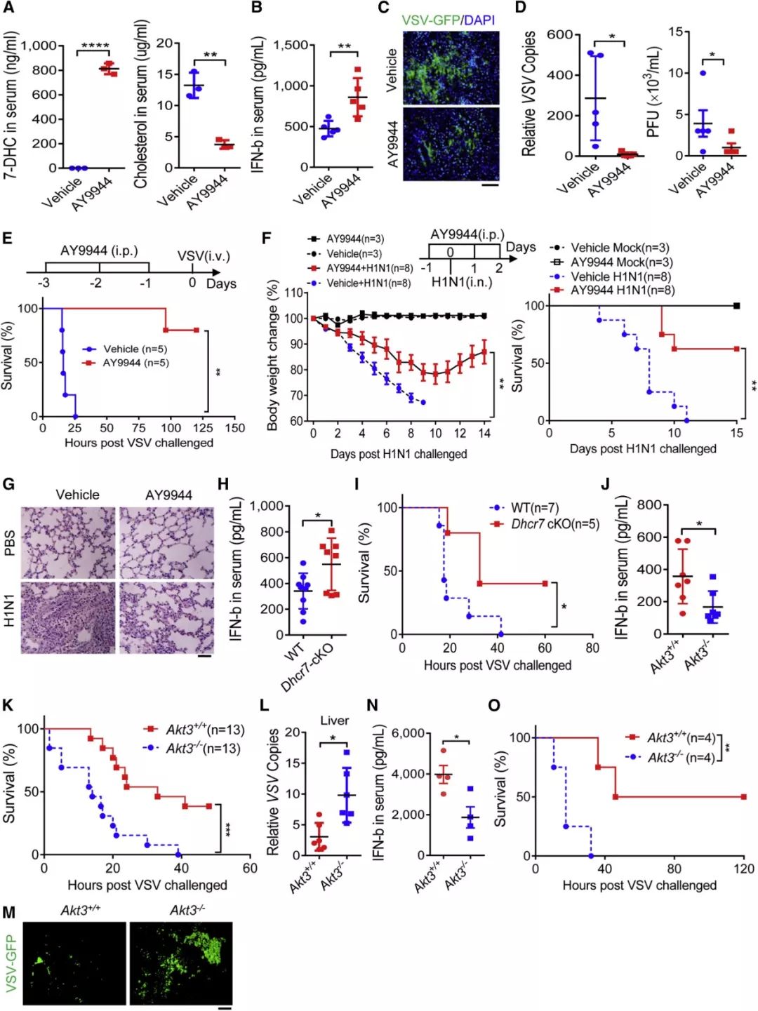 图 3. 靶向 DHCR7 整合胆固醇代谢和激活 AKT3 以增强抗病毒反应