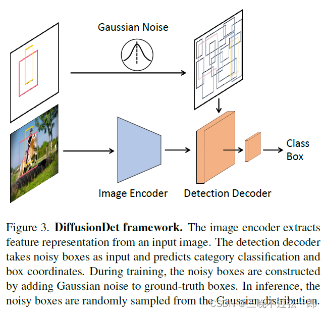 DiffusionDet流程:本文提出DiffusionDet, 将目标检测任务看作是目标框在位置(center coordinates)和尺寸(widths and heights)上的生成任务。在训练阶段:向GT框添加由a variance schedule控制的高斯噪声;然后这些带噪的框在backbone encoder得到的特征图上裁剪RoI区域的特征,继而进行训练以预测无噪的GT框。通过该训练阶段,DiffusionDet能从任意的框中预测到GT框。在推理阶段,DiffusionDet通过逆转扩散过程生成边界框,其调整了噪声先验分布到边界框的分布上。