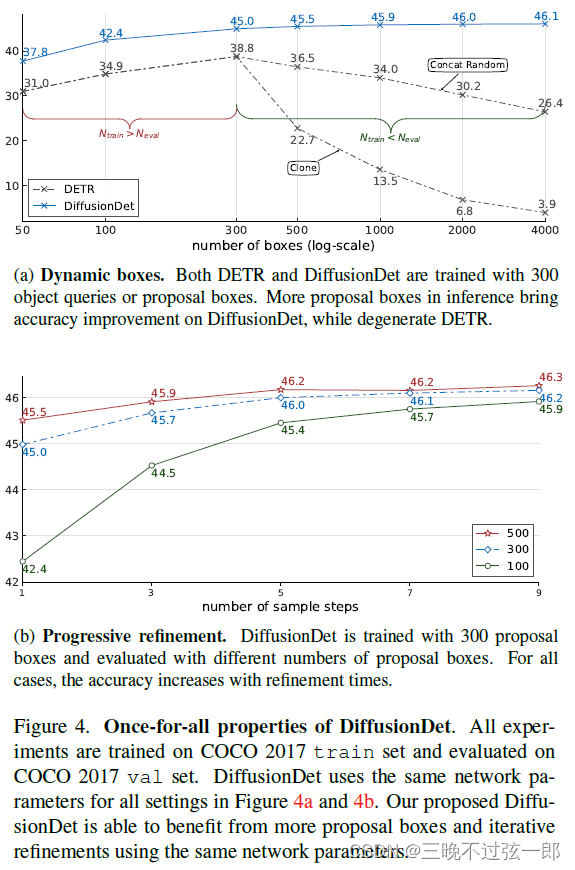 DiffusionDet的两大优势:DiffusionDet的noise-to-box的流程具有once-for-all的优势:可以仅训练网络一次,用相同的网络参数在推理阶段的各种各样的设置。