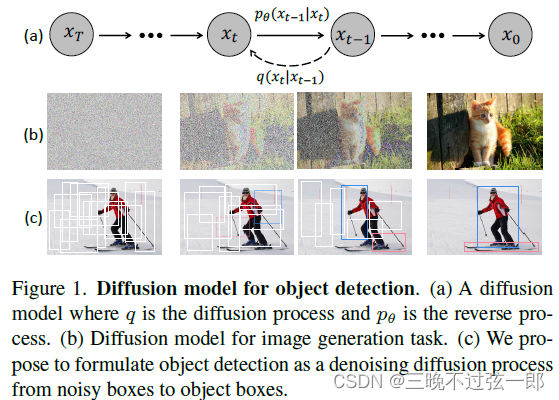本文核心思想:本文设计了一个新颖的检测框架,从一系列随机框中直接检测目标。随机的目标框不包含任何可学习的参数,即在训练阶段不用优化它,本文期盼渐进地改善这些框的位置和尺寸直到他们很好地覆盖了目标。这种noise-to-box的方法不需要任何启发式的目标先验或者可学习的queries,进一步简化了目标候选并推动目标检测的发展。如下图所示,noise-to-box的思想在降噪扩散模型中类似于noise-to-image的过程,noise-to-image是一类基于概率的模型通过可学习的降噪模型来逐渐移除噪声从而生成图像。扩散模型已经在许多生成任务上取得了巨大的进展,并开始在感知任务上探索。然而,扩散模型还从未在目标检测任务上成功应用。