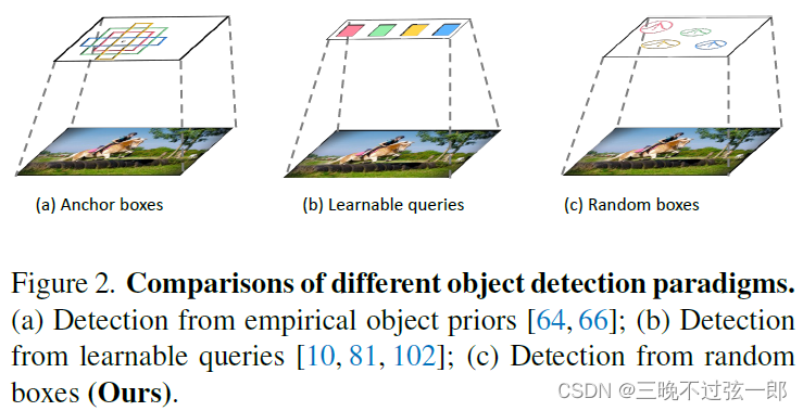 现有的目标检测方法:近年来目标检测方法随着目标候选的发展而不断改进,从经验对象先验(empirical object priors)到可学习目标查询(learnable oject queries)。具体地,大多数检测器通过对基于经验设计的目标候选定义一个代理回归模块(surrogate reegression)和一个分类模块来解决检测问题,比如滑动窗口(sliding windows),区域建议(region proposals),锚框(anchor boxes),和参考点(reference points)等。最近,DETR提出可学习的目标查询(learnable oject queries)来避免很多手动设计的网络模块并提出了一个端到端的检测pipeline,在基于查询的检测范式上吸引了大量的关注。