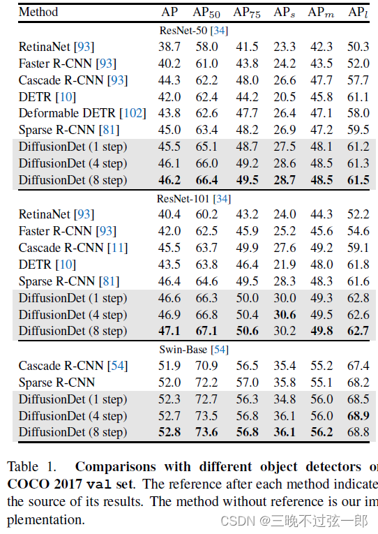 实验结果:在MS-COCO数据集上对DiffusionDet进行测试,ResNet-50做为backbone, DiffusionDet使用单采样步骤实现了45.5的AP,比Faster-RCNN(40.2 AP)和DETR(42.0 AP), Sparse R-CNN (45.0 AP)明显更好。此外,增加DiffusionDet的采样步数可将其AP值增加至46.2。现存的其他技术就没有这样的改善属性而且以迭代地方式评价时性能会显著下降。此外,在LVIS上进行了测试,DiffusionDet对长尾数据集的性能也很好,在Swin-Base backbone下实现了42.1的AP。