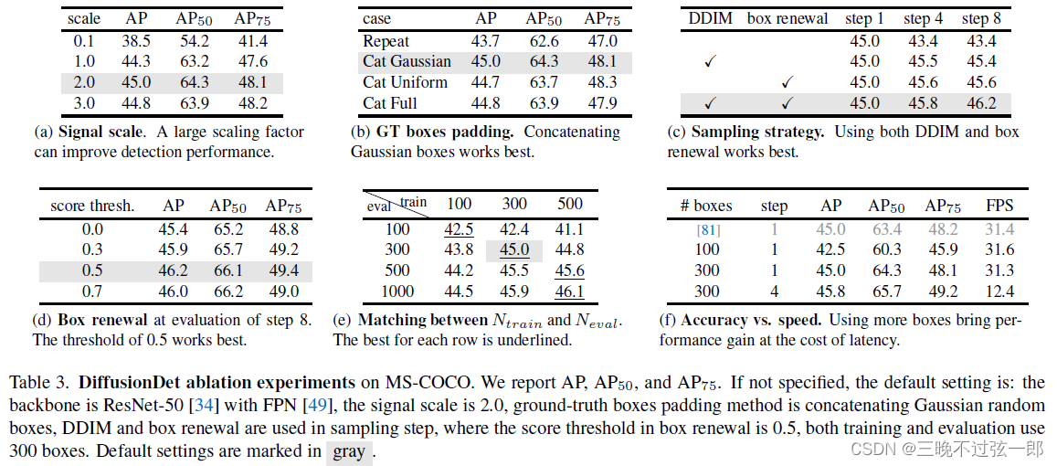 Sampling step. 在每个采样步骤中,随机框或者上一次采样的估计框被送入检测解码器中来预测目标类别和框的坐标。在获得当前步骤的框时,DDIM用于估计下一步的框。此外,不使用DDIM也行,但性能会大大下降。