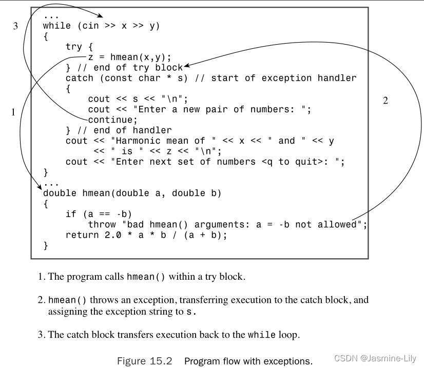 本段程序使用的是 throw一个字符串,原则上throw任意数据类型都可,但是一般情况下程序员喜欢throw异常类 相关函数:double hmean1(double a, double b);