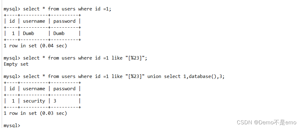 - 防过滤:1 like "[%23]" union select 1,database(),3 %23