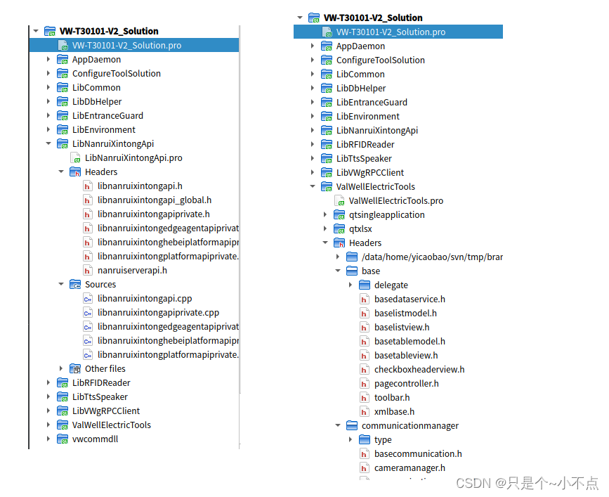 我们去到主程序的.pro文件下,.pro文件是qmake用来生成makefile文件的中间文件的,我们找到HEADERS和SOURCES这两个字段,这两个字段是写需要编译的源、头文件路径的(项目根目录的相对路径)。对.pro文件不了解的,可以去简单了解一下.pro文件详解