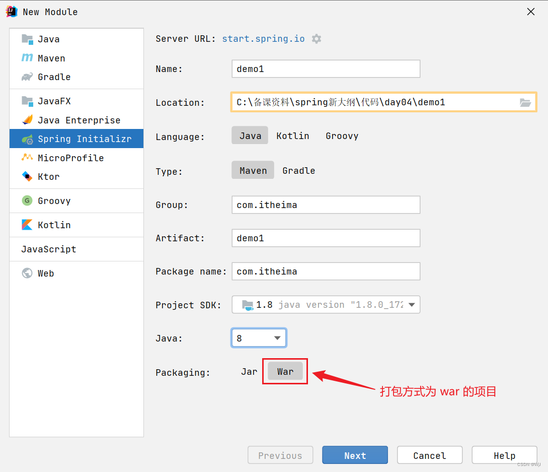 步骤1:创建模块,区别在于打包方式选择 war