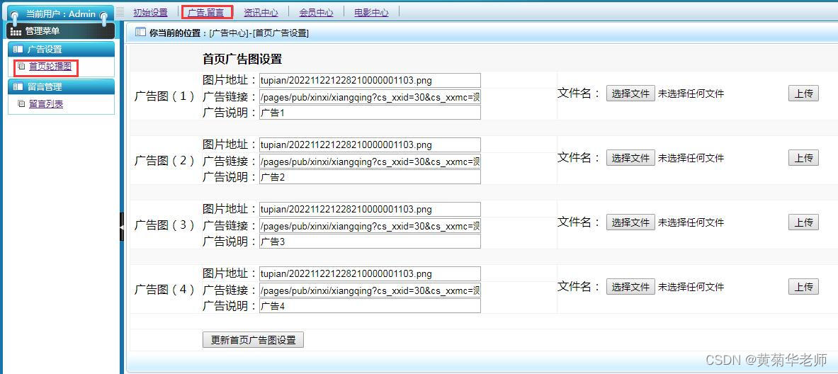 广告设置:上传图片和设置小程序首页轮播图广告地址