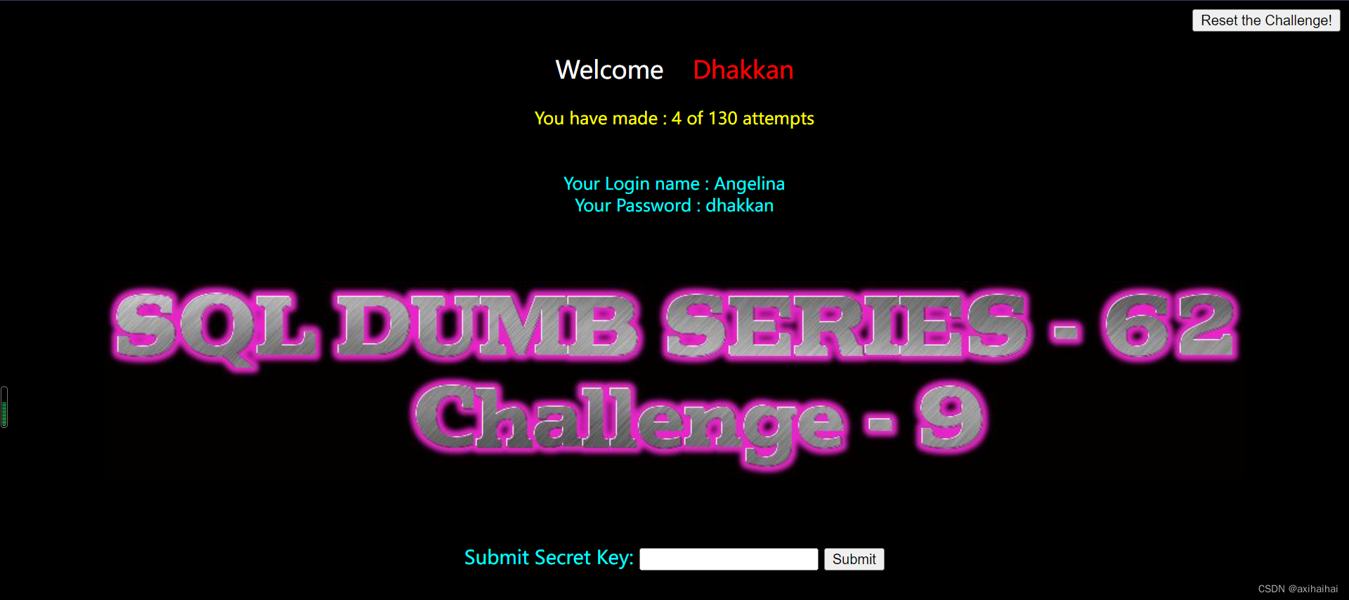 欢迎界面提示我们一共由130次机会 而且还是以id作为注入点 每次重置都会随机分配表名、字段名、表格数据