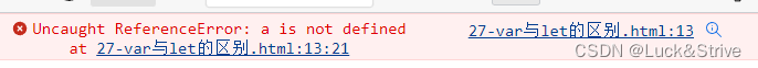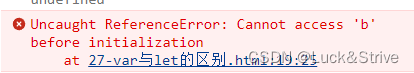 使用var声明变量时,可以先使用后声明,不会报错,而使用let声明变量时,如果未先声明变量却去使用它的话,就会出现错误。例如下面这段代码: