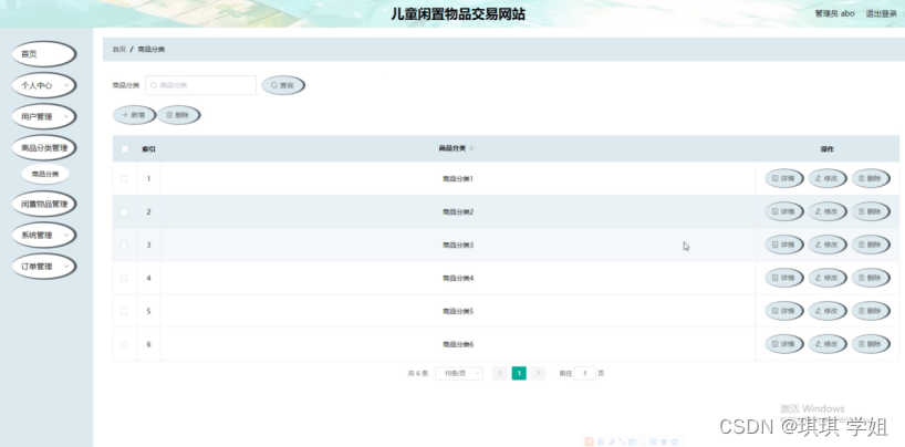 商品分类管理,在商品分类管理页面可以对索引,商品分类等内容进行详情,修改和删除等操作,如图5-9所示。
