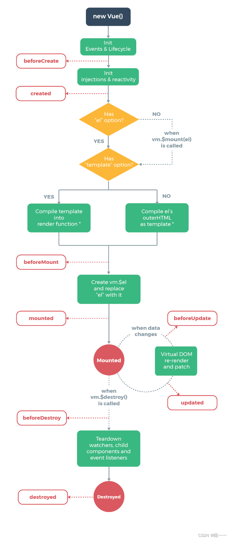 每个Vue实例在被创建时都要经过一系列的初始化过程--例如,需要设置数据监听、编译模板、将实例挂载到DOM并在数据变化时更新DOM等。同时在这个过程中也会运行一些叫做 生命周期钩子的函数,这给了用户在不同阶段添加自己的代码的机会。