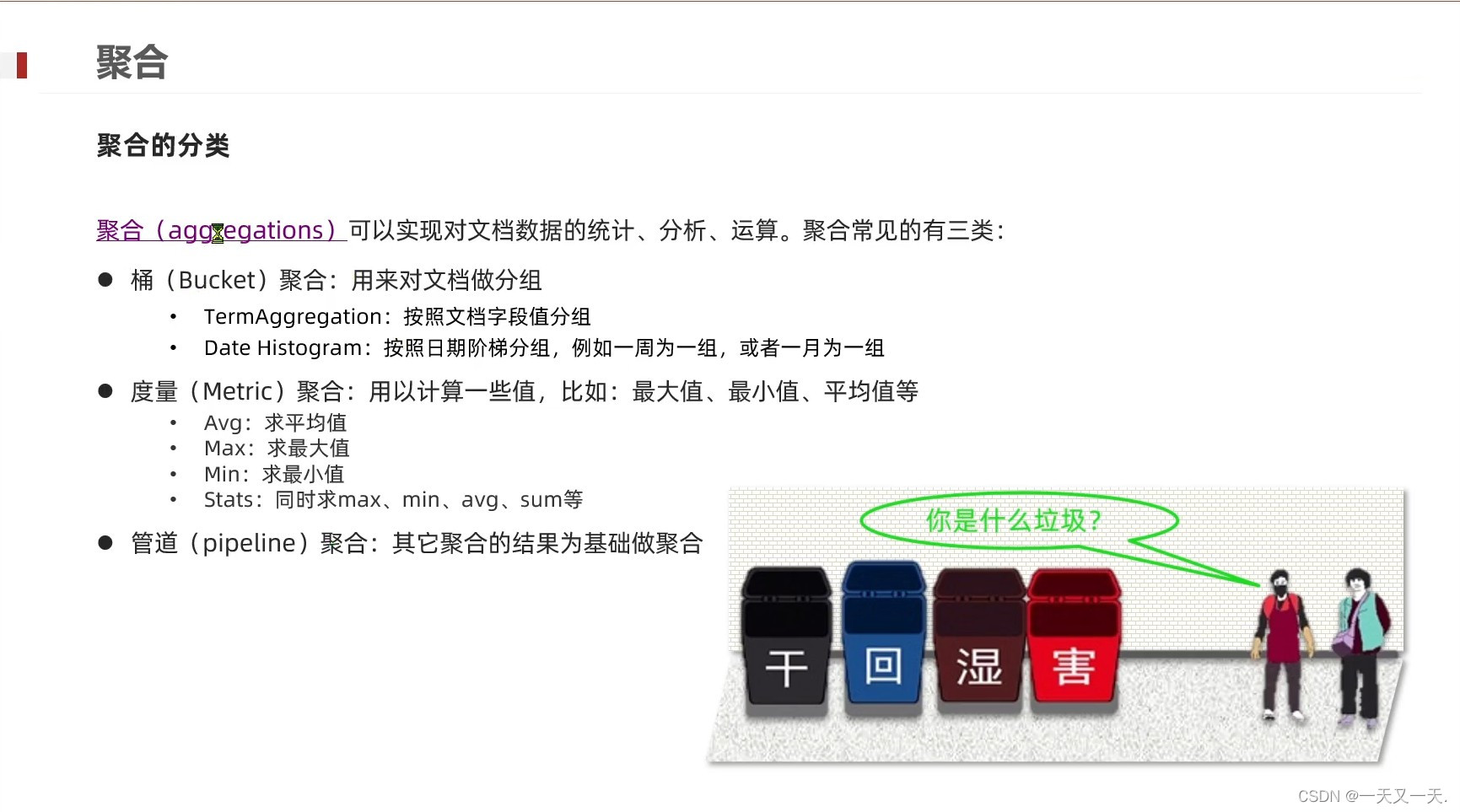本章学习了什么是聚合以及Bucket、Metric聚合的DSL语法