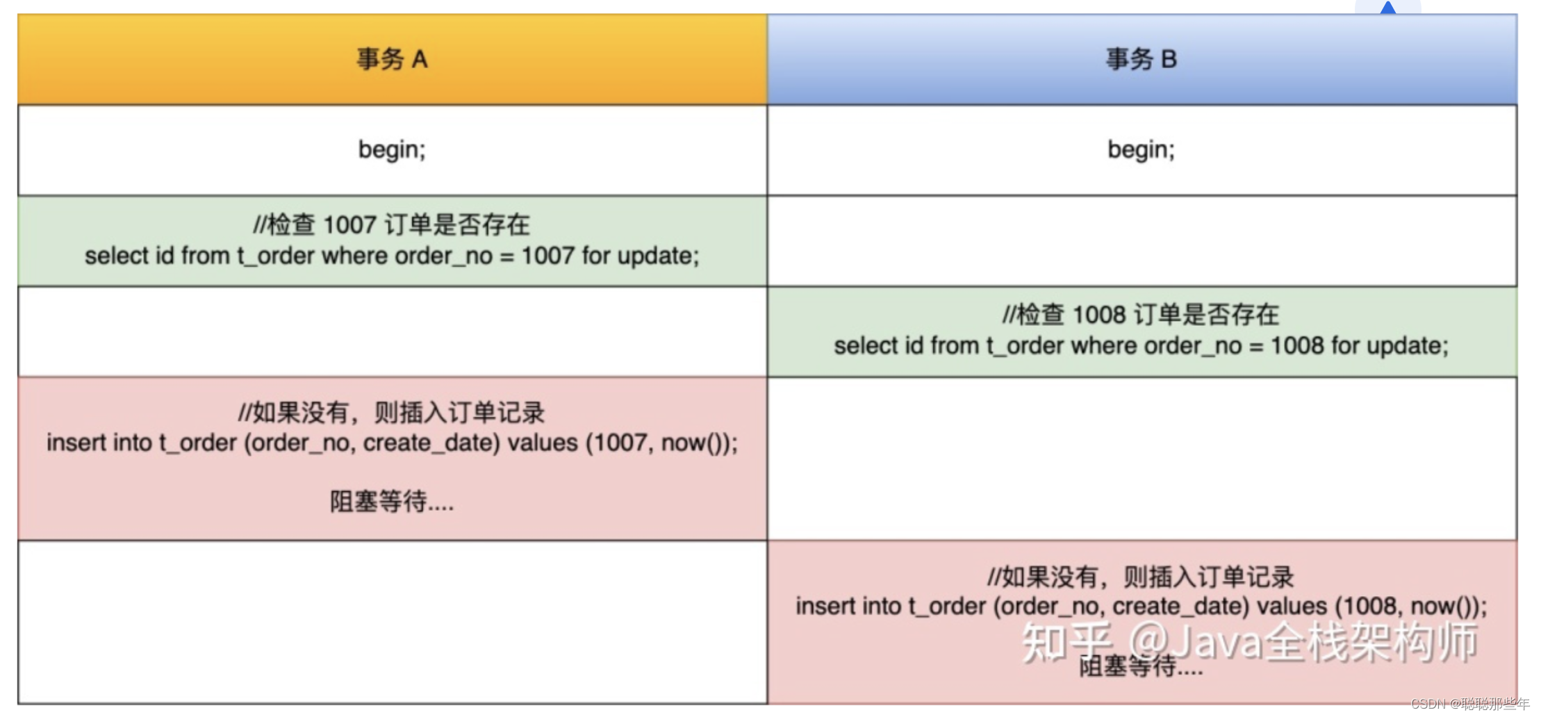 插入意向锁与间隙锁是冲突的,所以当其它事务持有该间隙的间隙锁时,需要等待其它事务释放间隙锁之后,才能获取到插入意向锁。而间隙锁与间隙锁之间是兼容的,所以所以两个事务中 select ... for update 语句并不会相互影响。