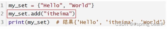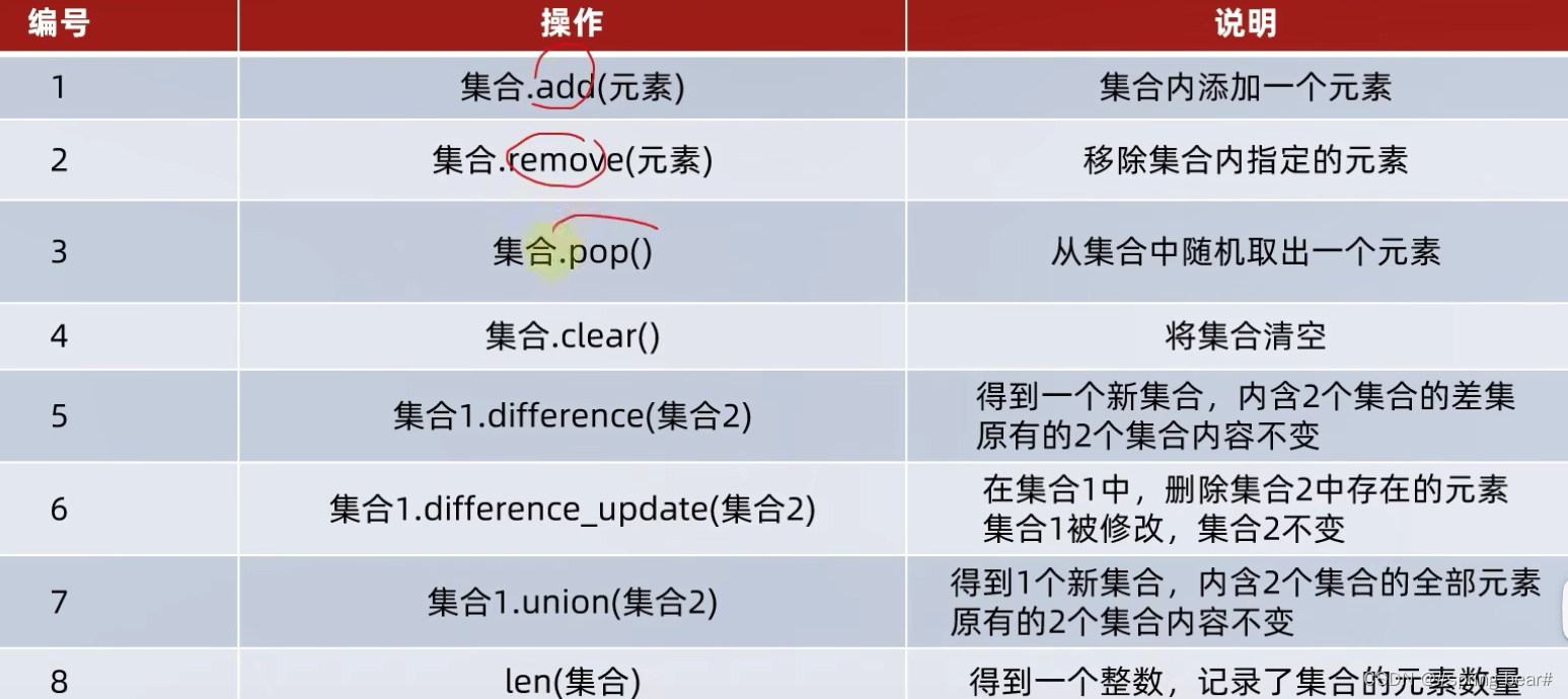 语法:集合.remove(元素) 将指定元素从集合内移除