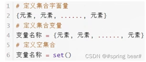 - my_set = {"春天的熊","joker","blame",True,21,'blame'}