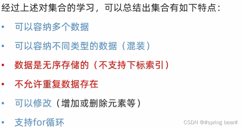 由于集合无序,因此不支持:下标索引访问 也因此集合不是序列