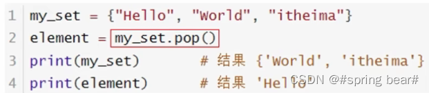 - print(f"随机取出的元素是:{element},取出后集合结果为{my_set}")