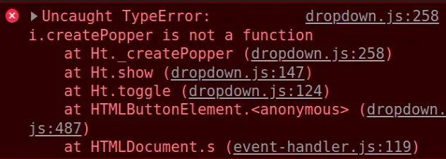 “createPopper”不是我们使用引导程序时发生的函数错误 需要popper.js脚本的组件,但我们没有将其加载到页面上 或在引导脚本之后加载它。要解决此错误,请包括 在运行 JavaScript 代码之前引导捆绑脚本。