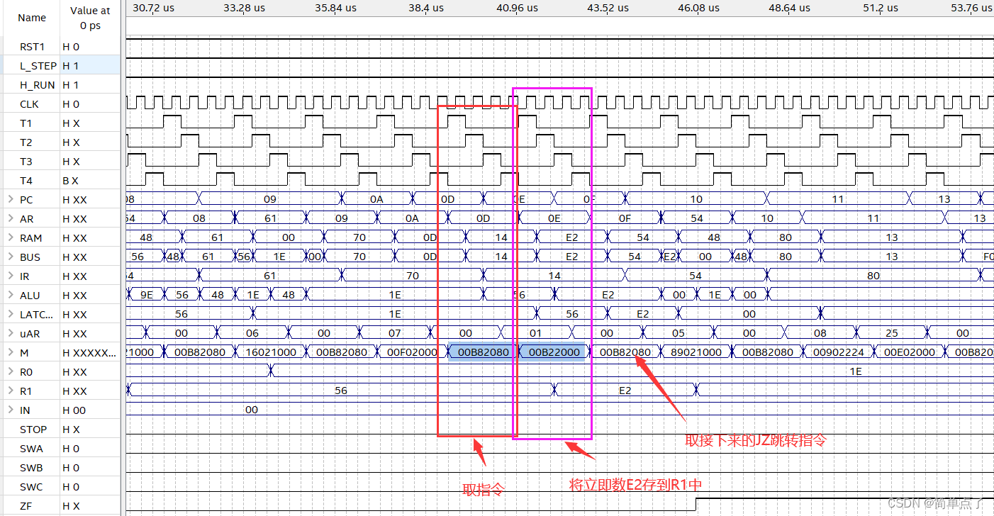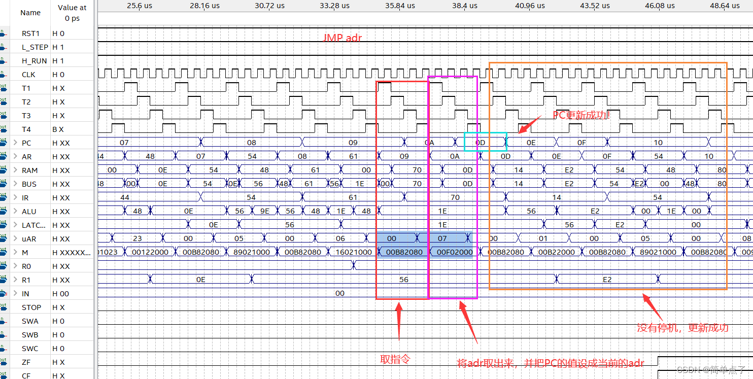 当ZF=1的时候就是结果为0的标志,测试JZ adr的时候用的是ADD R1,R0的结果,上面算出来为0。当不是0的时候就正常的PC+1,否则就是跳转到指定的位置。比如我写的这个ZF=1的时候直接跳转到停机的位置(第一张图),不是0的时候就正常往下执行(第2张图)。