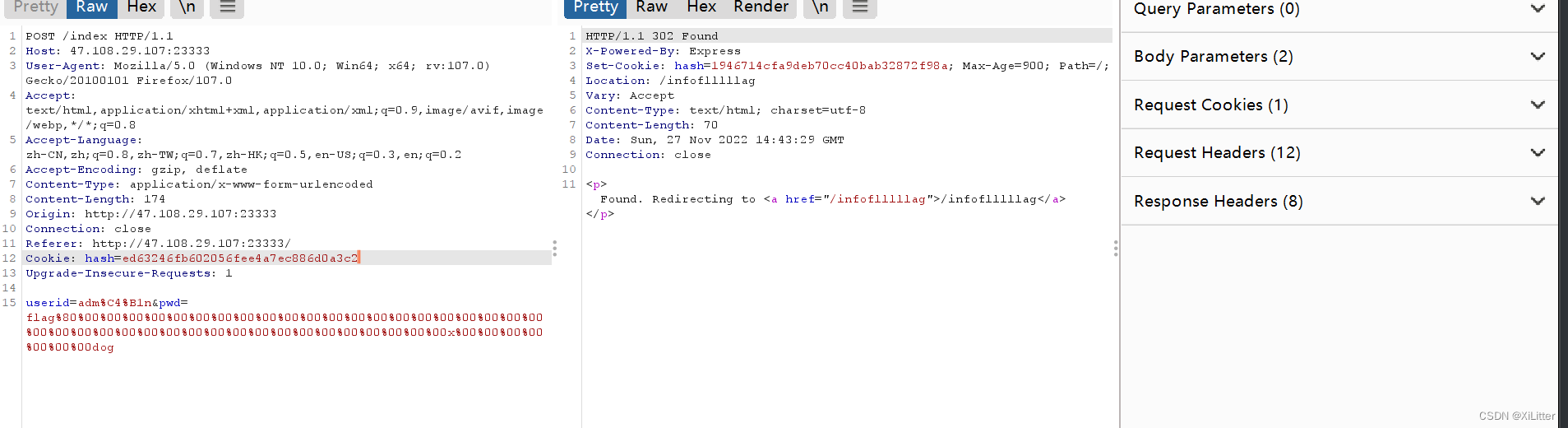 哈希扩展攻击,没怎么了解过,先学会用工具,在这留个坑以后再学。在做题的时候,我对这个注释的理解还是有些偏差,用工具解出hash和密码,hash要添加在cookie里。注意要把\x修改为%